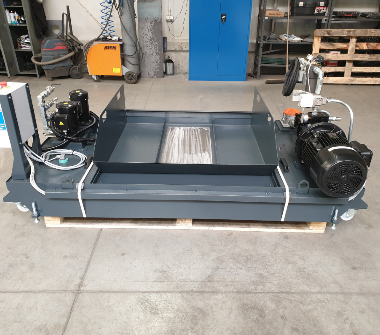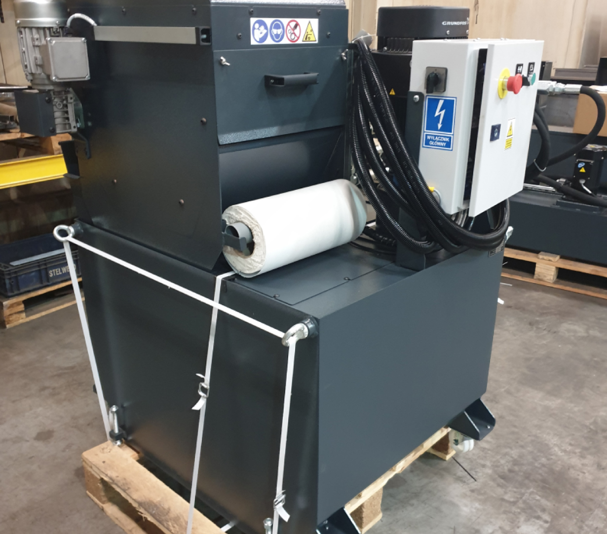 Transporter z łańcuchem i zgarniaczami oraz bębnem filtrującym. Przeznaczony głównie do aluminium i stali.